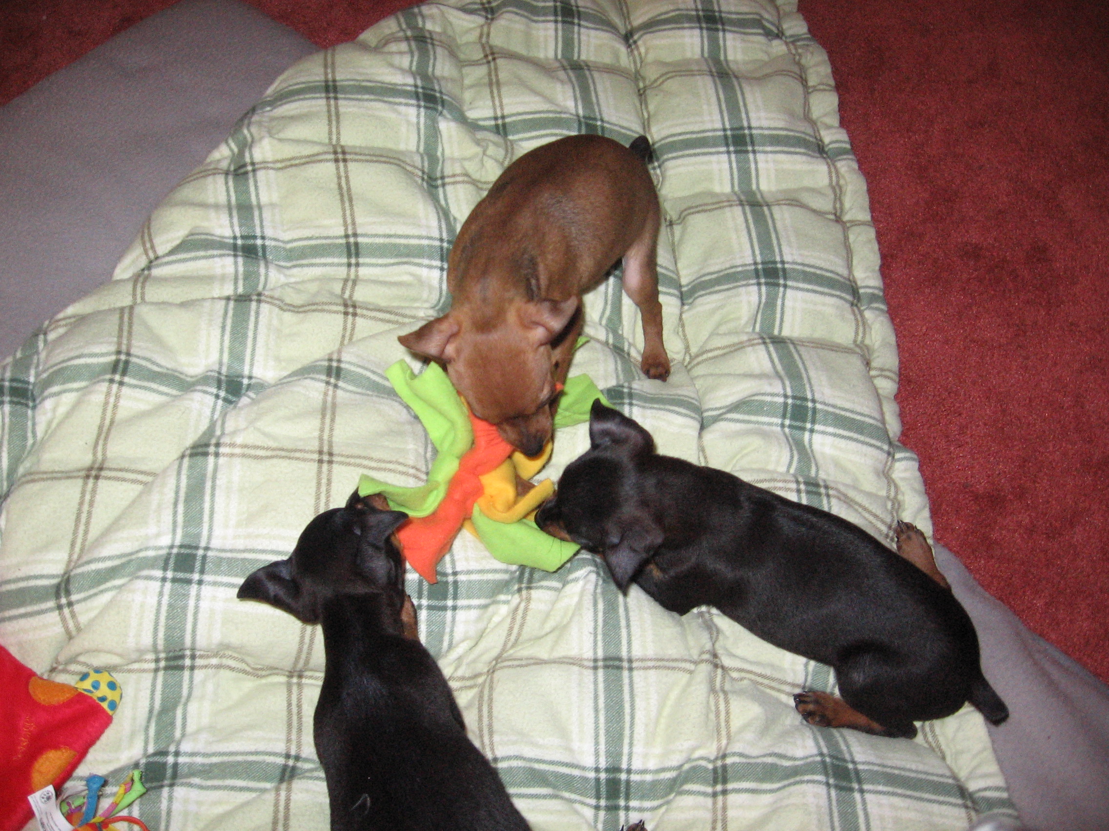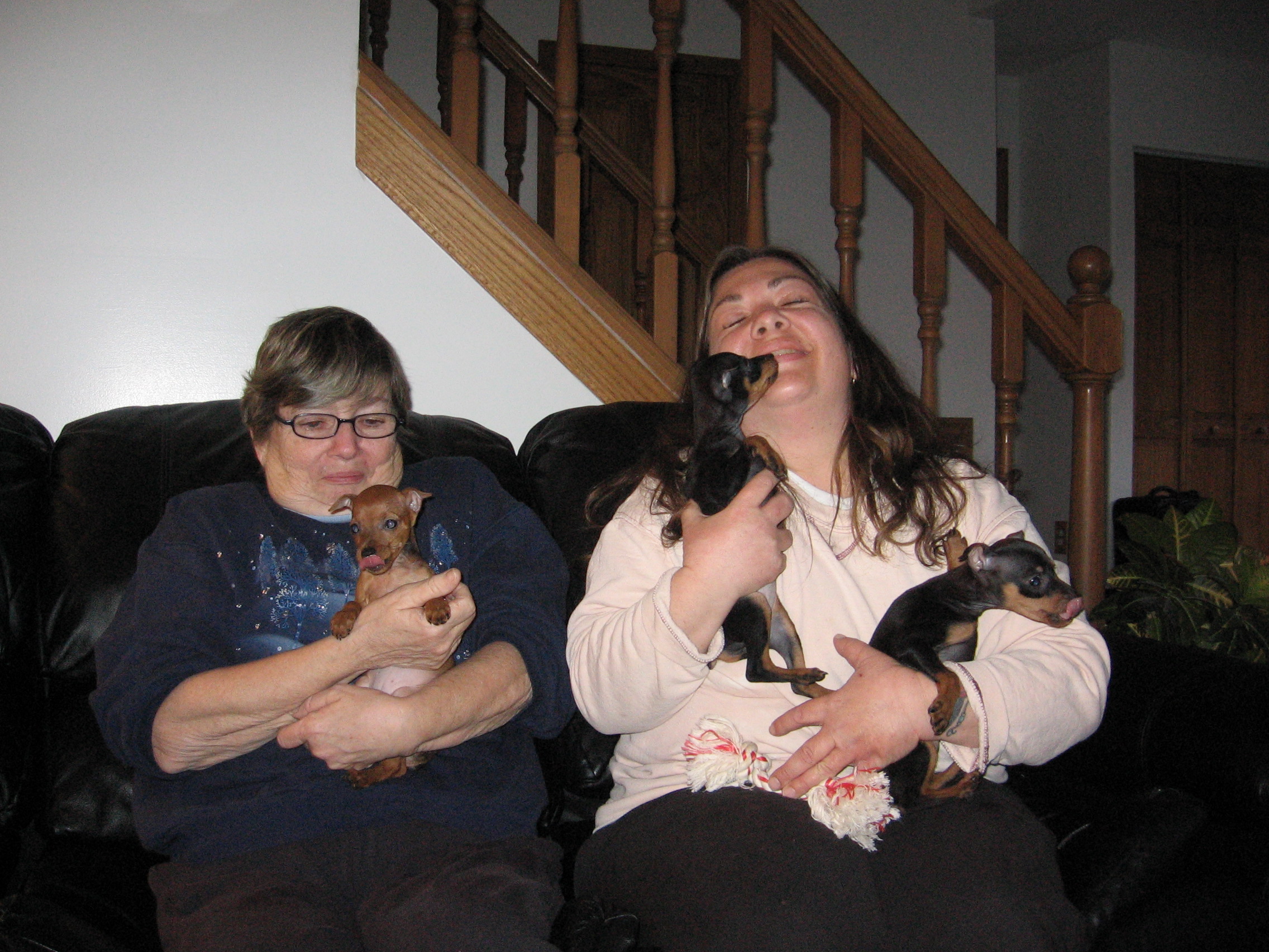I began to wonder if this mouthy issue was normal. What do inquiring minds do when they are searching for answers? Why, they turn to the Internet, of course. The pups had been in our possession for about a week and a half when I received an unexpected gift, school was cancelled due to a snow day. I was ready to do some research and hopefully find answers to our pressing issue. I spent several hours on my computer hoping to find advice for the mouthy behavior. I explained our situation so many times that afternoon that I lost count. My scenario described how Bob and I had just acquired three female Min Pin littermates and were seeking advice on how to best handle mouthy puppies. I emailed breeders and trainers, and posted on various dog forums, oblivious to the fact that my picture perfect vision of our little family was about to be shredded into a million pieces.
