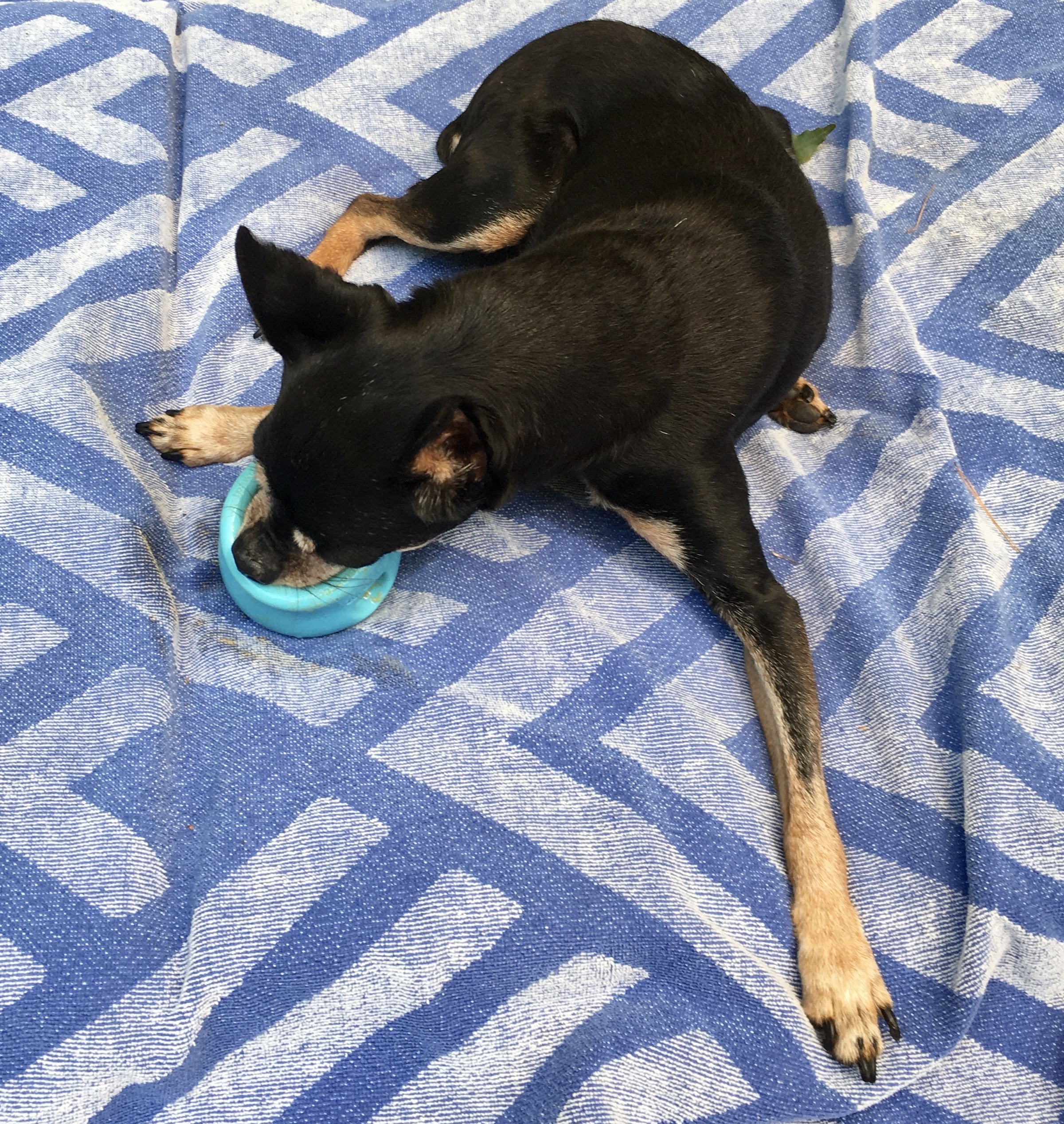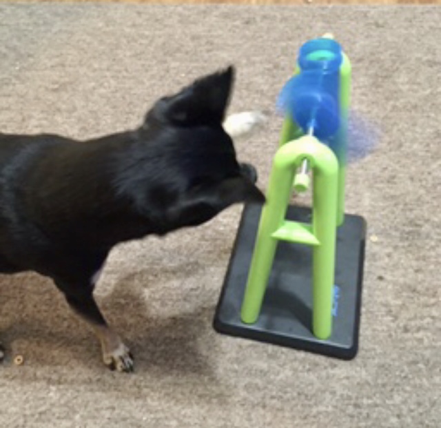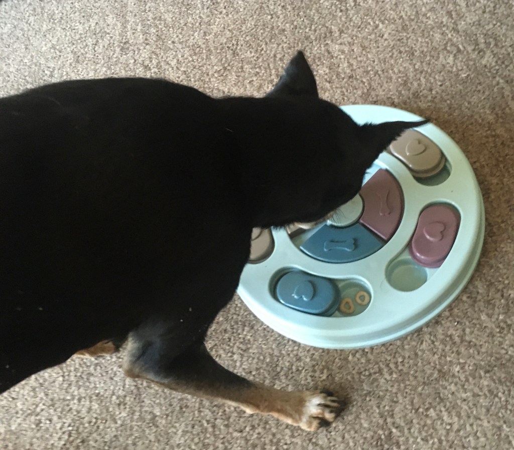 Puzzles used to be another top activity, but Malibu lost interest, and I couldn’t figure out why. When she was diagnosed with canine cognitive dysfunction last year, I learned that her lack of interest was a symptom of CCD. Earlier this spring, I pulled out an easy puzzle and tossed some food in it. To my surprise, Malibu interacted with it. For now, I’m just using this simple puzzle. If Malibu continues to show interest, I will slowly re-introduce her other puzzles.